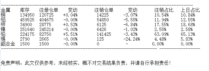 LME 10月30日基金属仓单数据