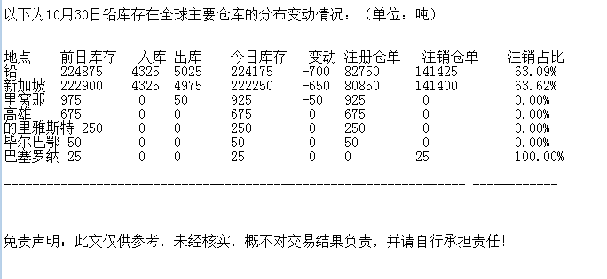 LME 10月30日铅库存分布情况