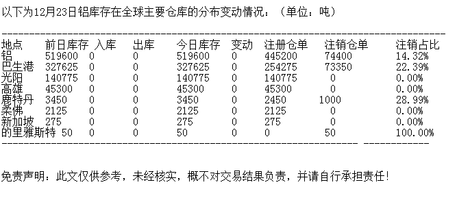 LME 12月23日铝库存分布情况