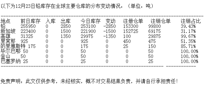 LME 12月23日铅库存分布情况