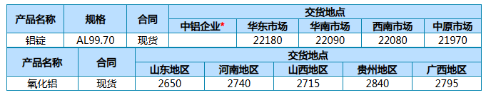 中铝股份公司主要产品12月30日现货报价