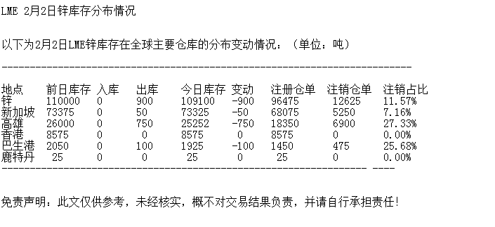 LME 2月2日锌库存分布情况