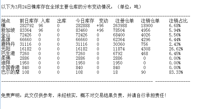 LME 3月24日镍库存分布情况