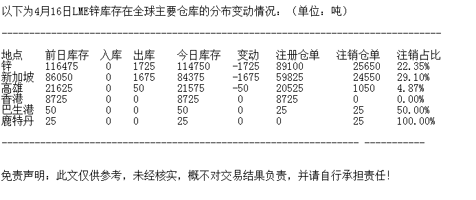 LME 4月16日锌库存分布情况