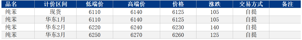 早间,华东纯苯市场现货价格上涨。现货买盘6110,卖盘6140;1下买盘6110,卖盘6140;2下买盘6220,卖盘6240;3下买盘6250,卖盘6270。单位:元/吨。