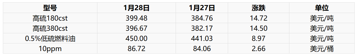 1月29日新加坡燃料油现货市场价格上调