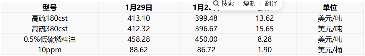 1月30日新加坡燃料油现货市场价格上调