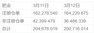 NYMEX 3月12日钯金库存统计