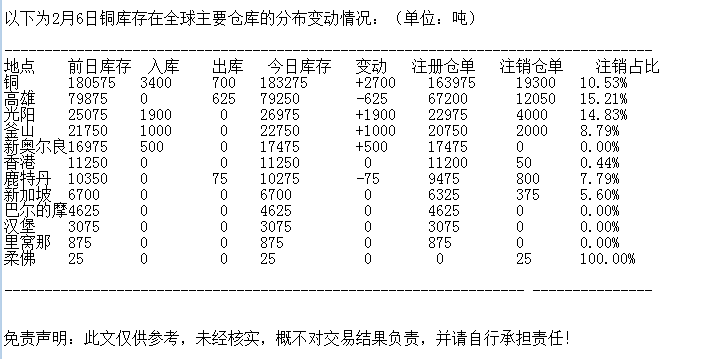 LME 2月6日铜库存分布情况