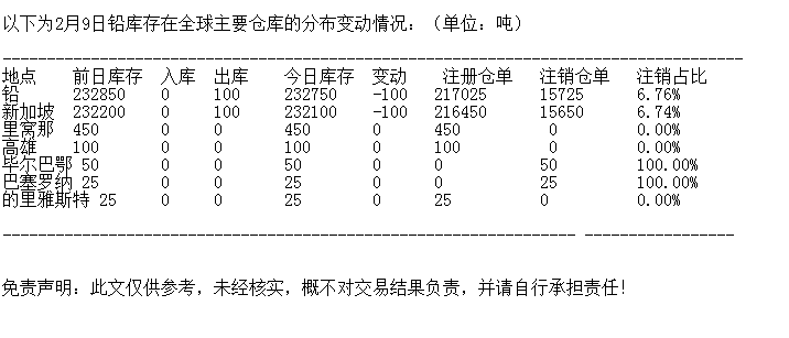 LME 2月9日铅库存分布情况